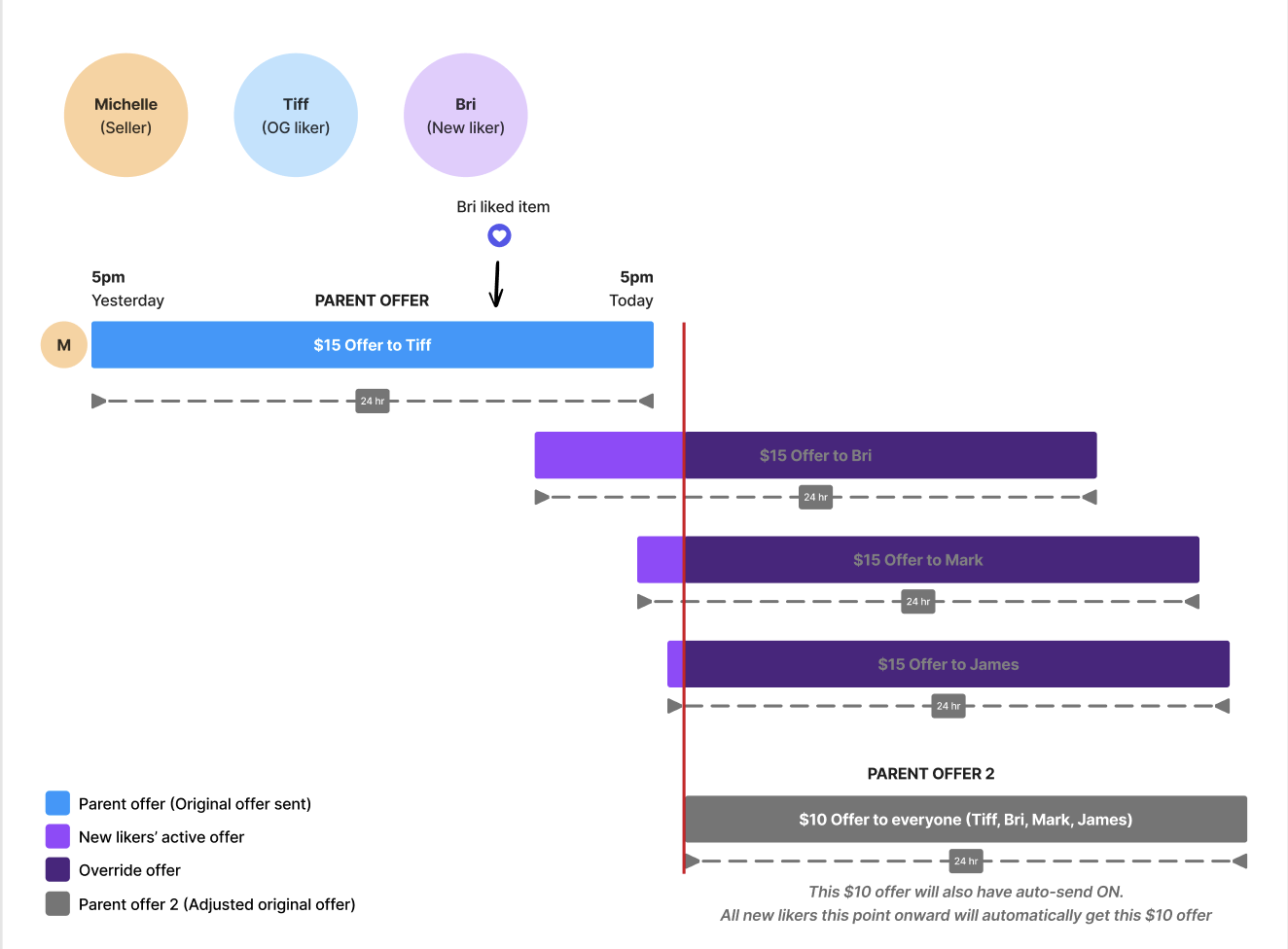 To support sellers in reaching new likers efficiently, I worked with PM, content designer to brainstorm different ways to reimagine offer logic. From our workshop, we co-created this new offer logic using a Parent Offer model: