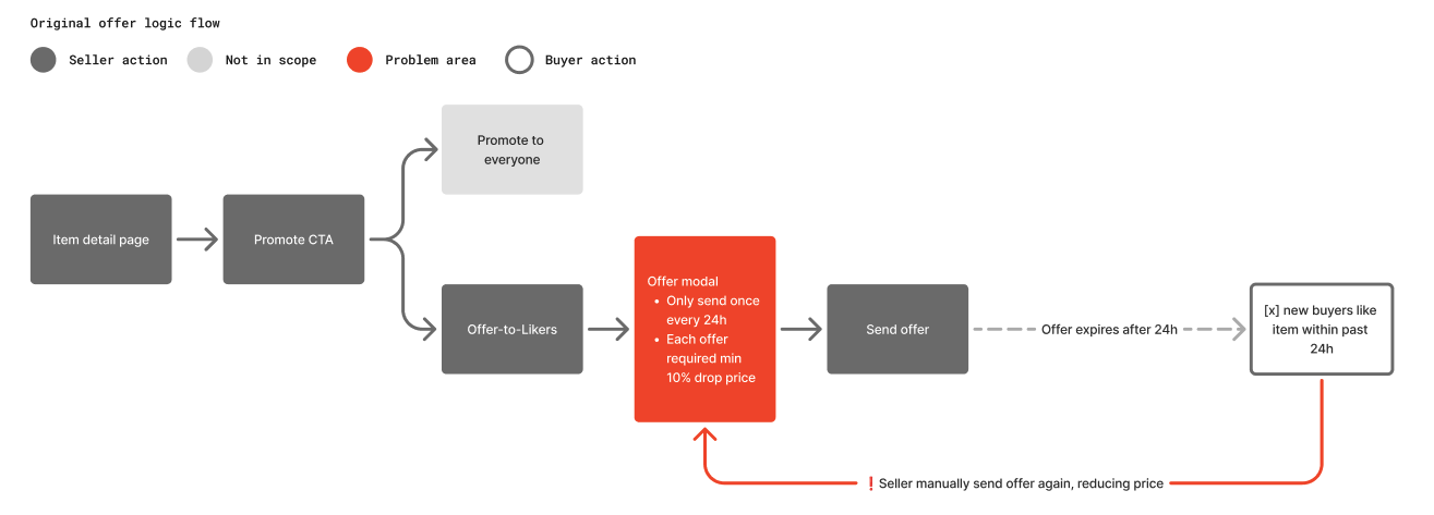 Mercari’s seller promotional feature, Offer-to-Likers, drove 7% of orders, but it's rigid rules prevented sellers from promoting to new Likers unless they dropped prices again. This limited reach and conversion during peak buyer interest. The goal is to redesign the offer logic and interface to let sellers automatically extend active offers to new Likers, without introducing friction.